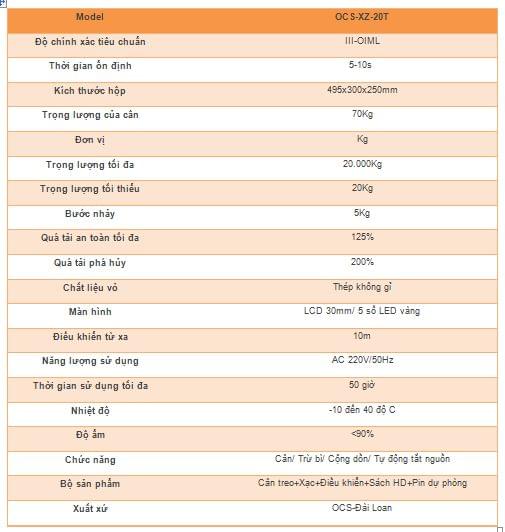 Cân treo điện tử OCS-XZ-20T đạt độ chính xác cấp III-OIML, thời gian cực kỳ ổn định nhanh (10s), hiển thị trọng lượng hàng hóa ngay khi treo lên móc cân.